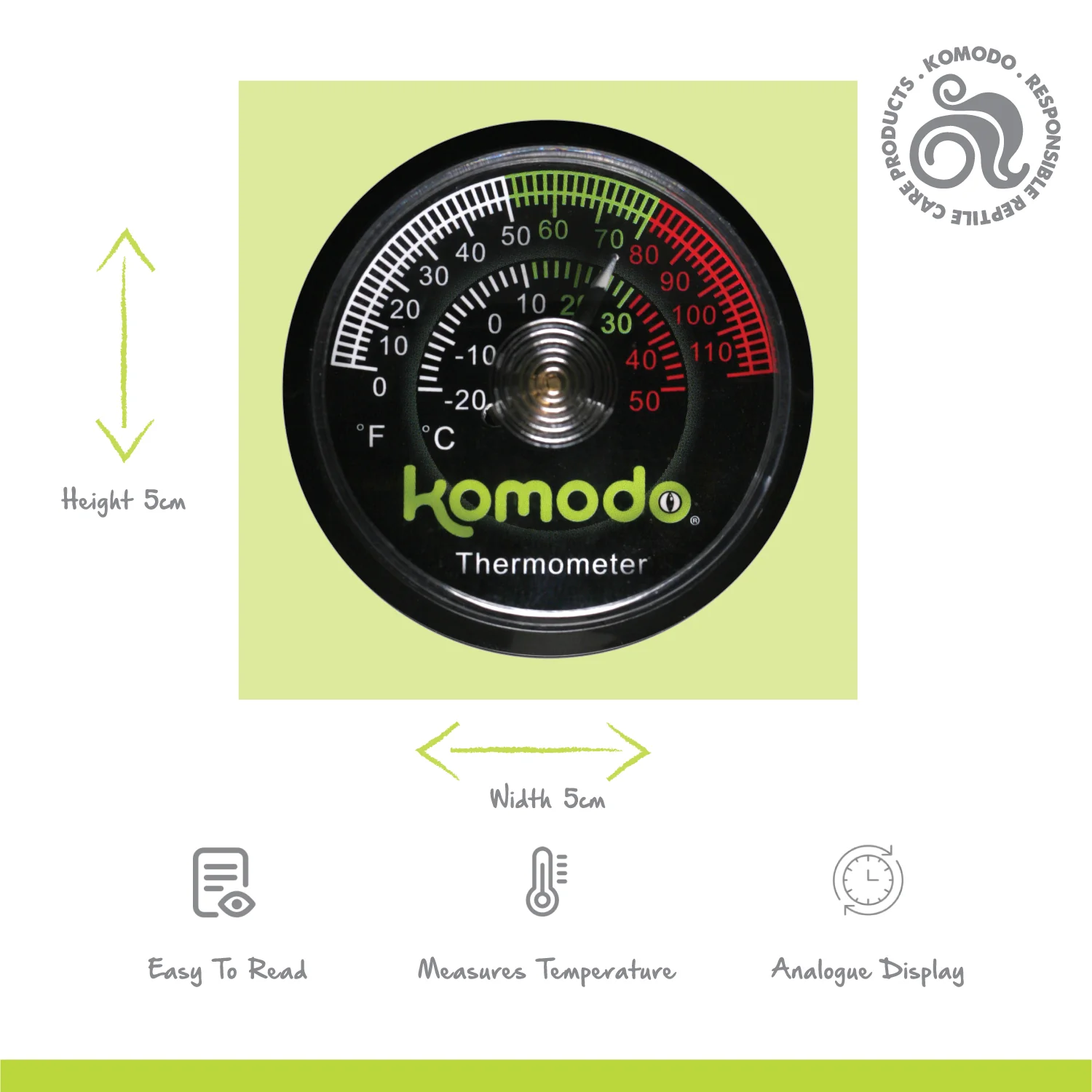 This Komodo Thermometer is designed for accurately measuring and monitoring temperature in reptile habitats. Featuring an analogue display with a colour-coded temperature scale, it makes it easy to maintain the proper environment for your reptile.