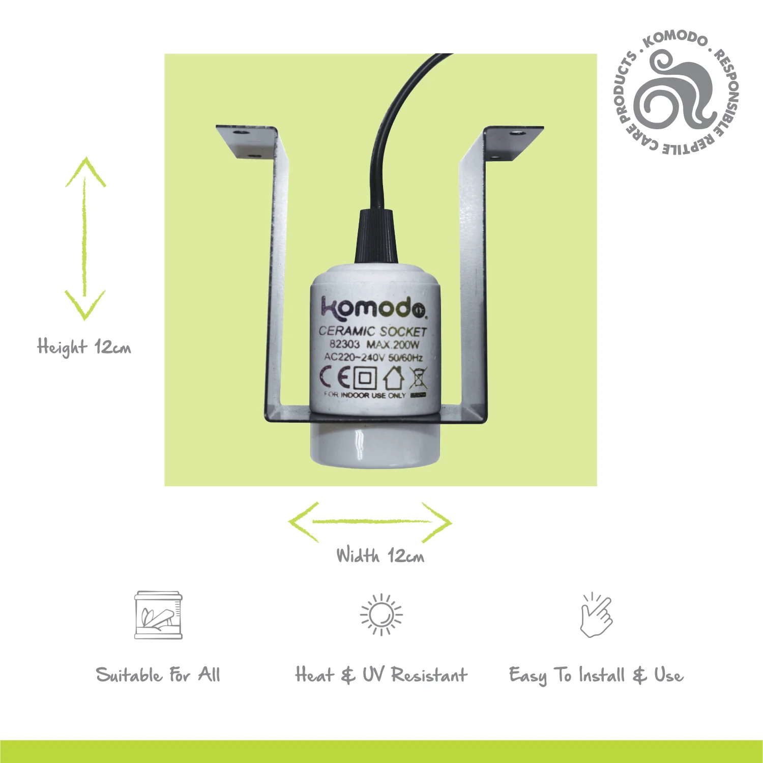 Additionally, it's crucial to ensure that reptiles do not come into direct contact with the bracket during use, as the ceramic fixture can become extremely hot. Designed for indoor use, this lamp fixture is suitable for various reptile enclosures and features four mounting apertures for easy and secure installation. With its durable construction and user friendly design, it provides a reliable and safe lighting solution for any reptile habitat.